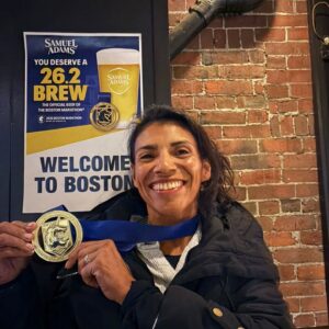 Lili con su medalla de participante en Boston, misión cumplida